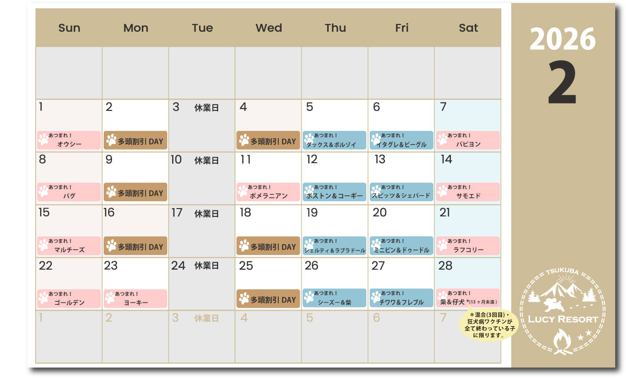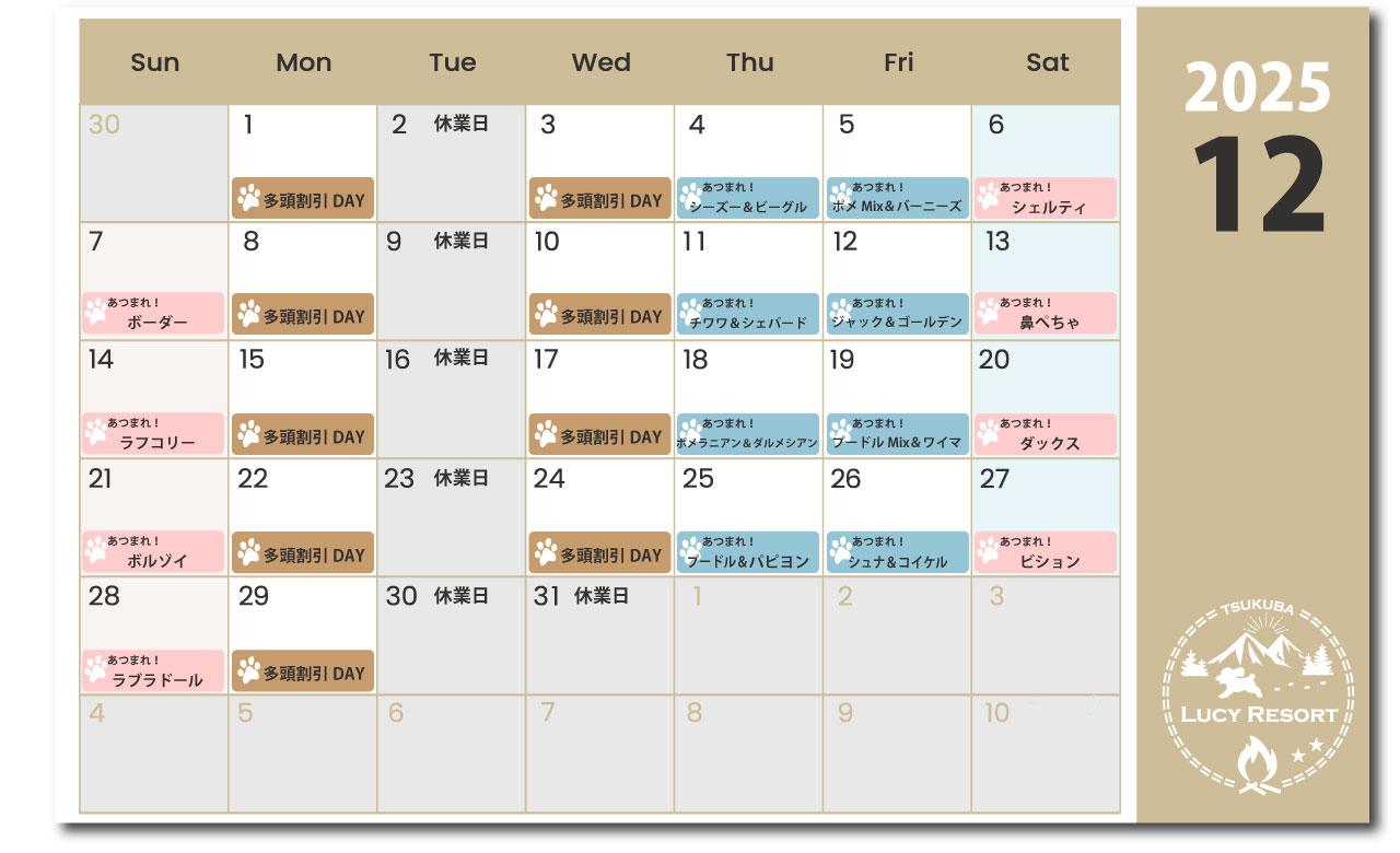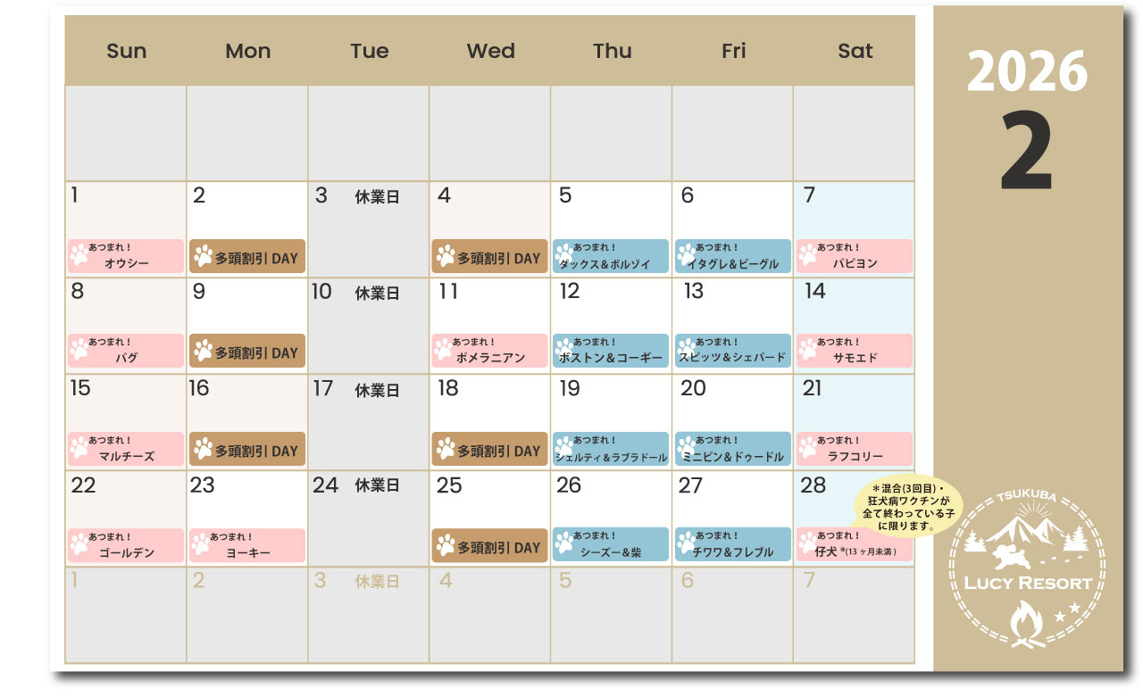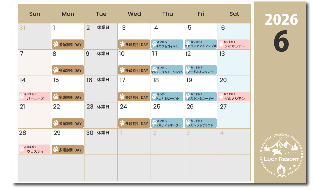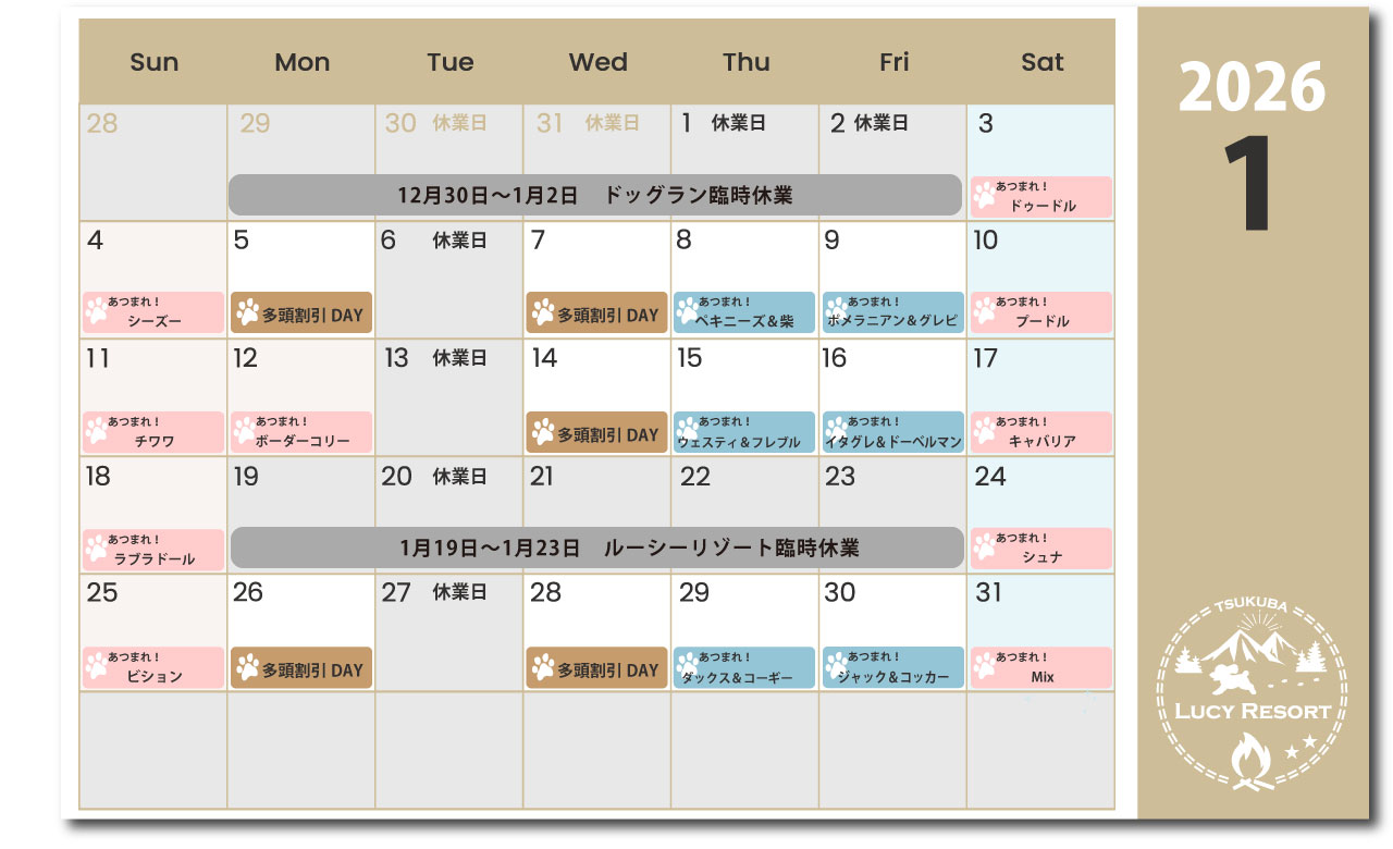 わんこDAYの対象の犬種は入場料が割引価格でお得にルーシーリゾートパークを遊ぶことができます!愛犬が該当するわんこDAYが開催するか、、わんこDAYカレンダーを確認ください。