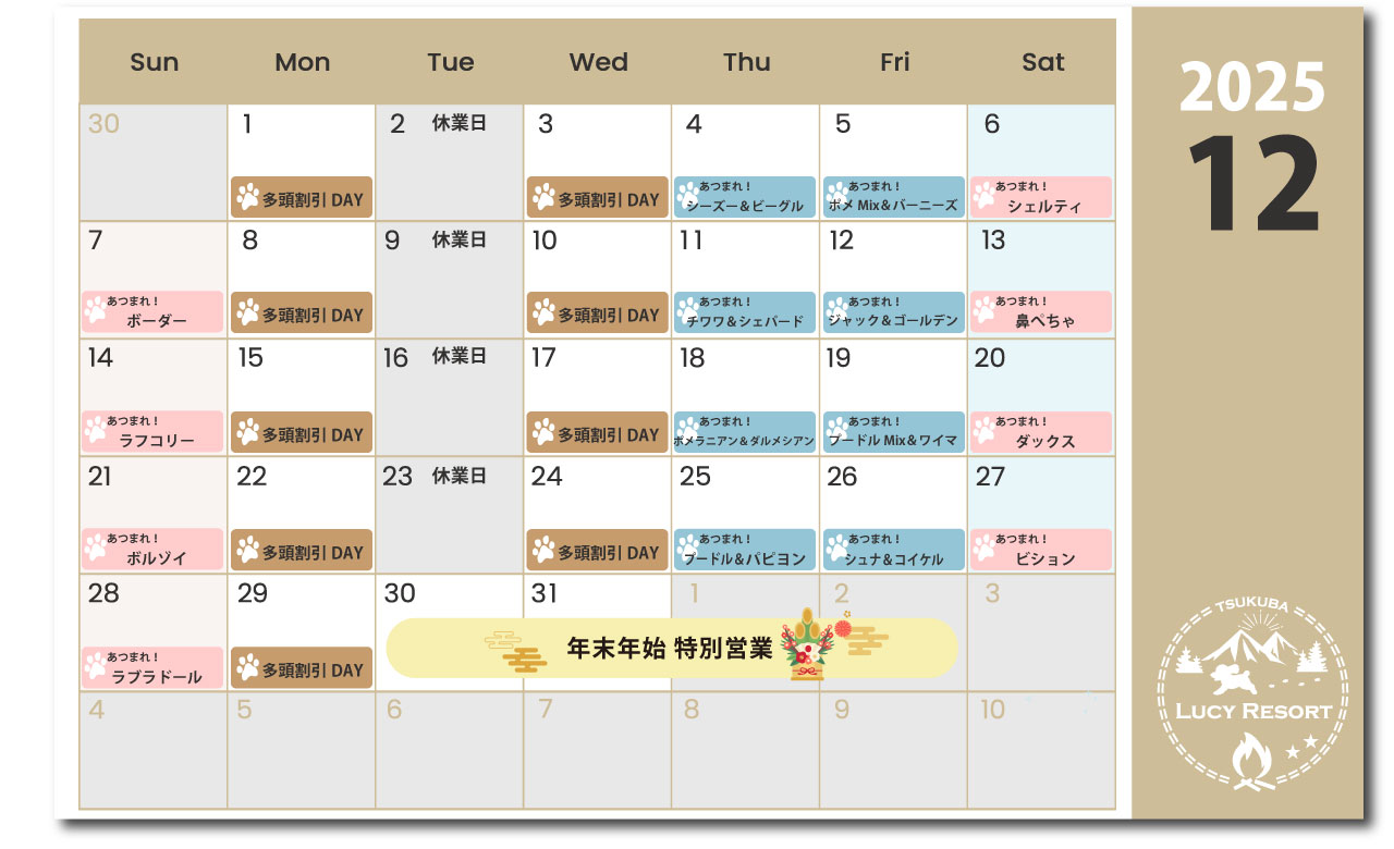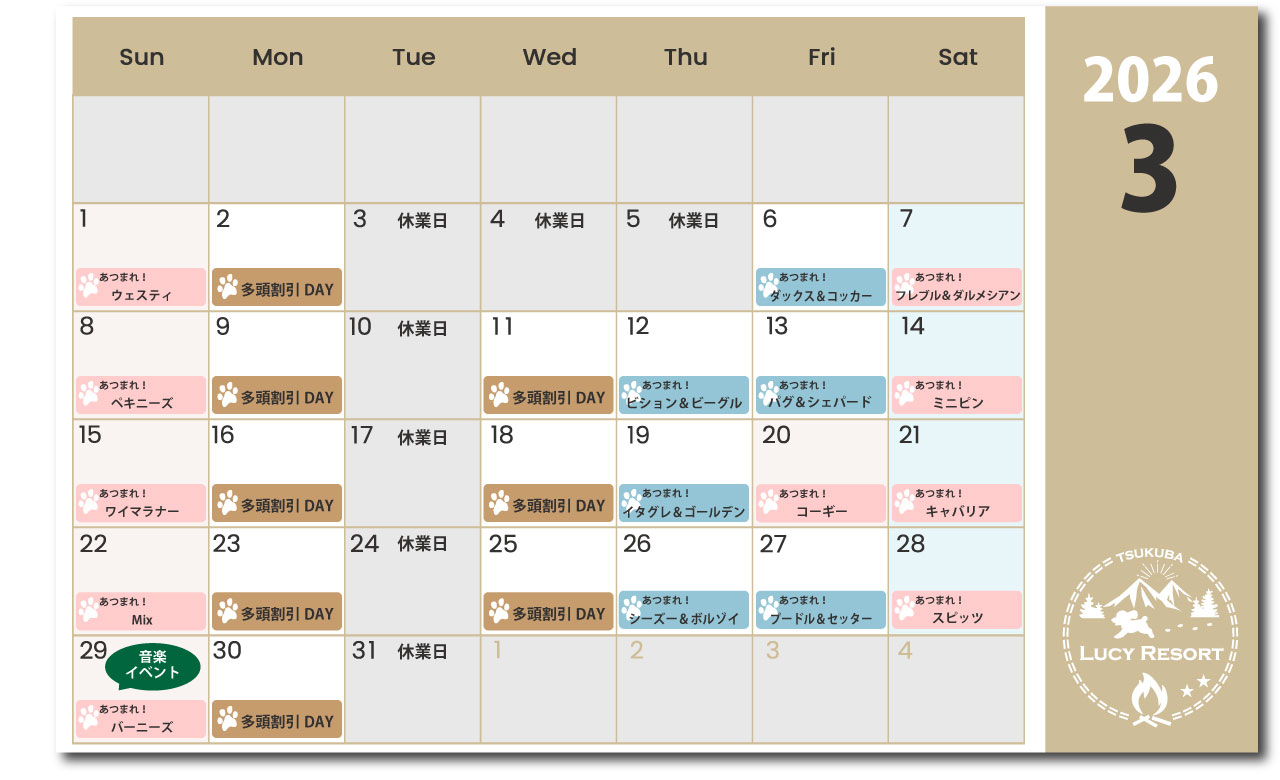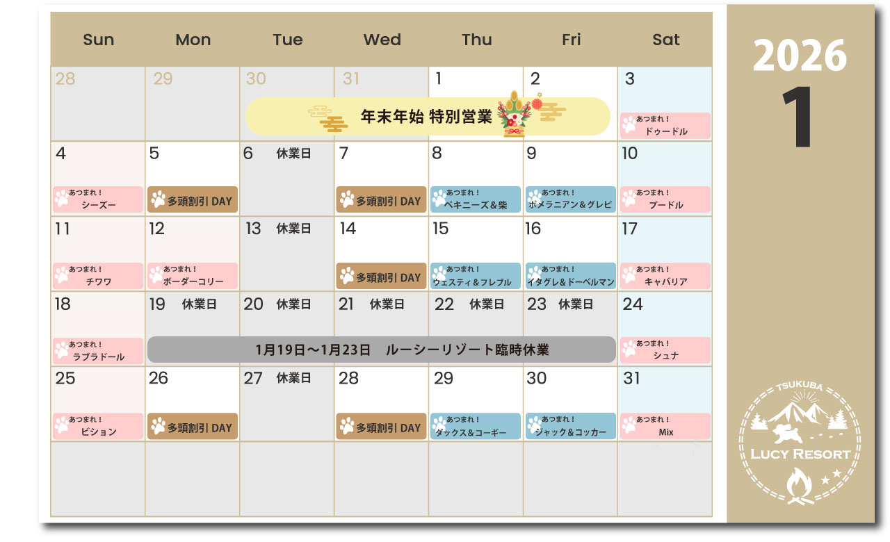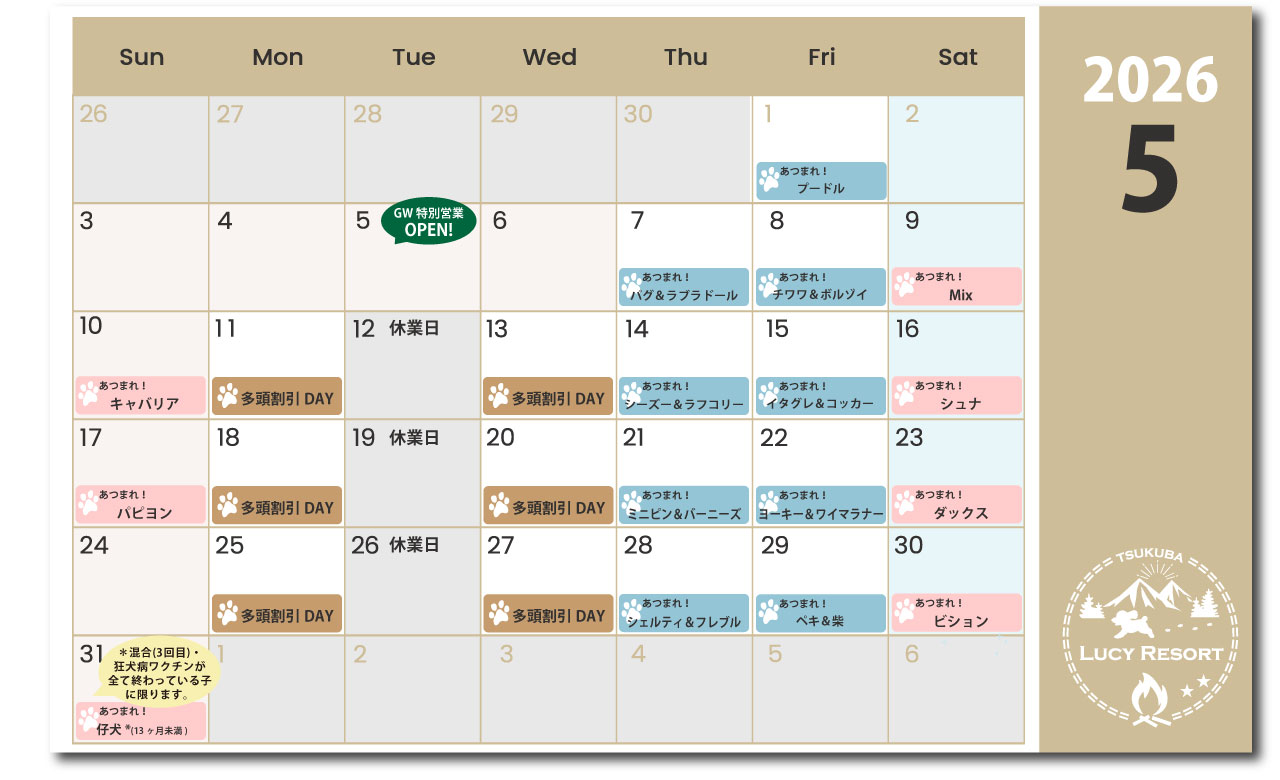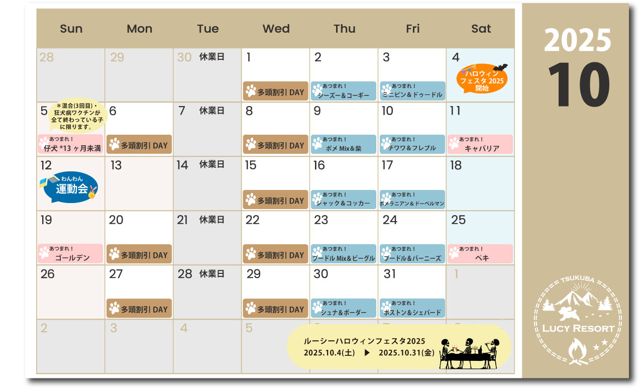 わんこDAYの対象の犬種は入場料が割引価格でお得にルーシーリゾートパークを遊ぶことができます!愛犬が該当するわんこDAYが開催するか、、わんこDAYカレンダーを確認ください。